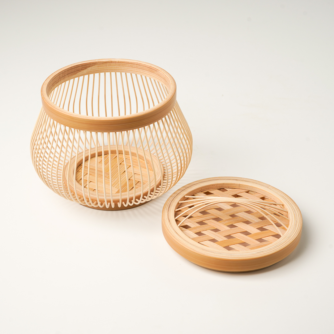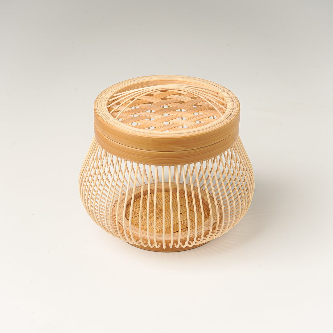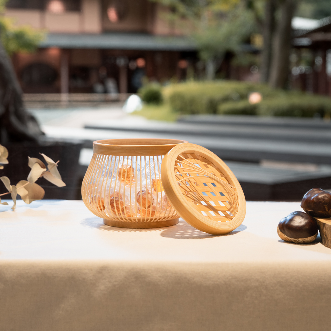 くびれたラインとふっくらとした丸みが美しく、竹ひごでつくる持ち手のついた蓋が可愛らしい人気の蓋付き小物入れ「小町」。