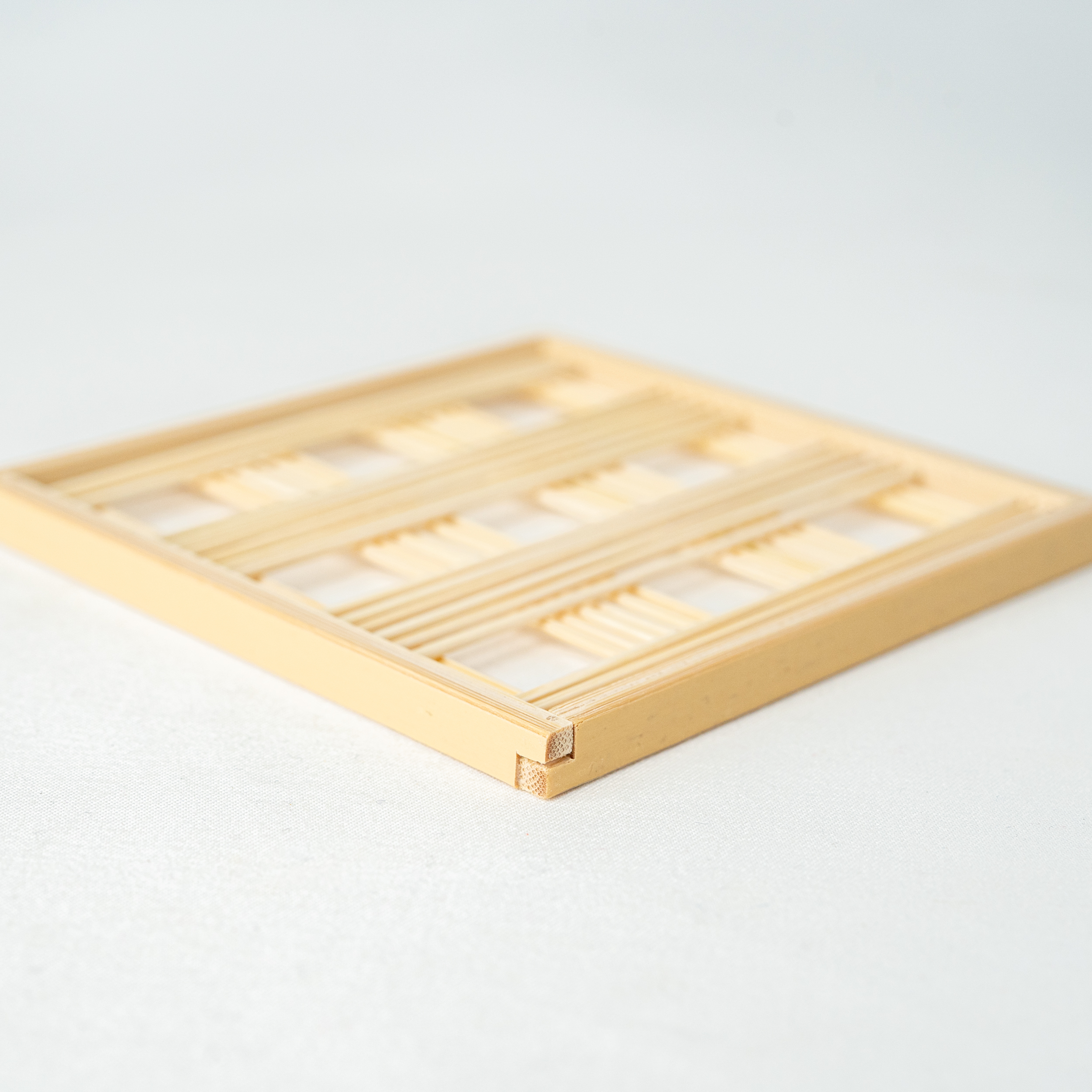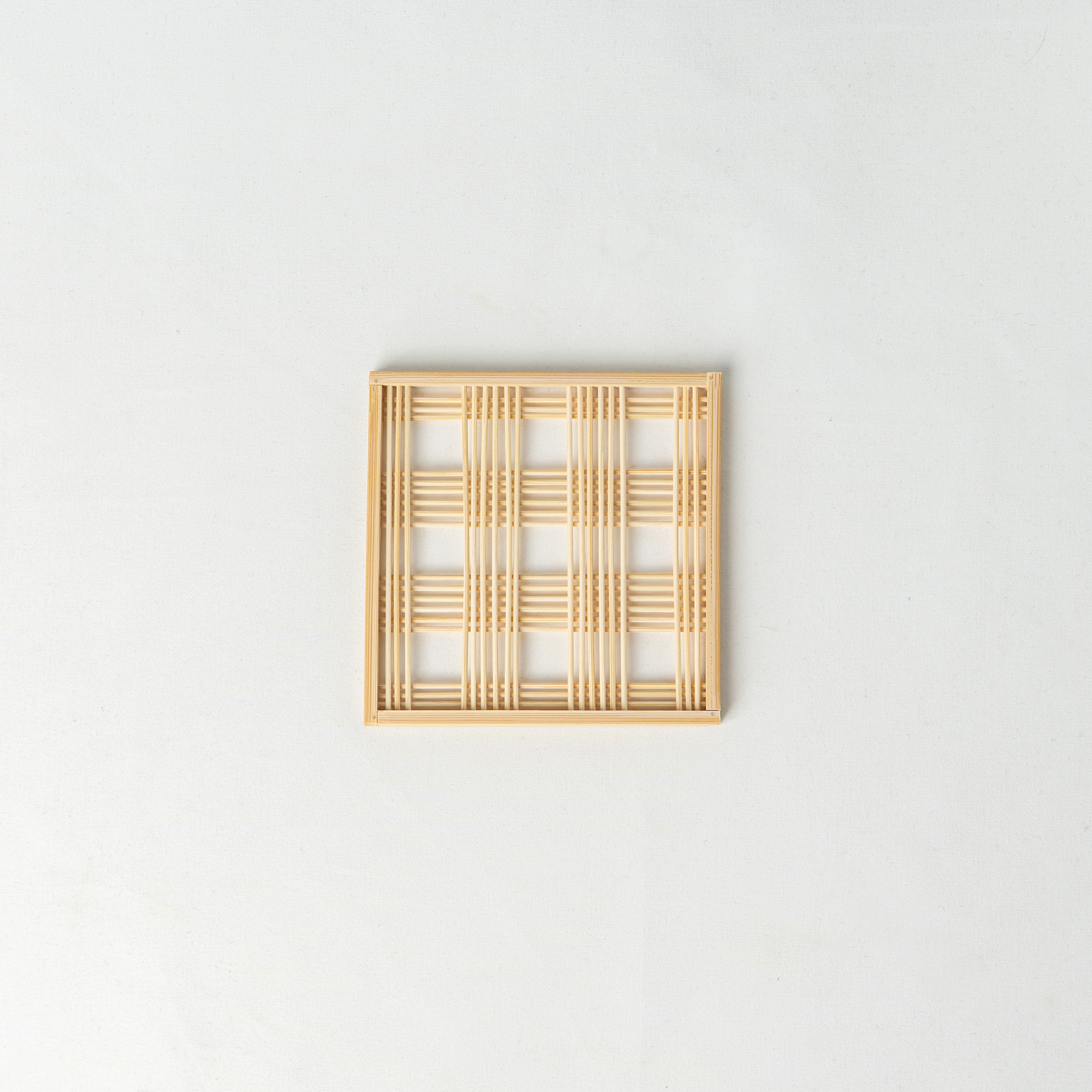 四角い竹の枠にヒゴをしならせながら差していきます。交差したヒゴは繊細ながらしっかりとして、コンパクトなすっきりとしたデザインが魅力です。