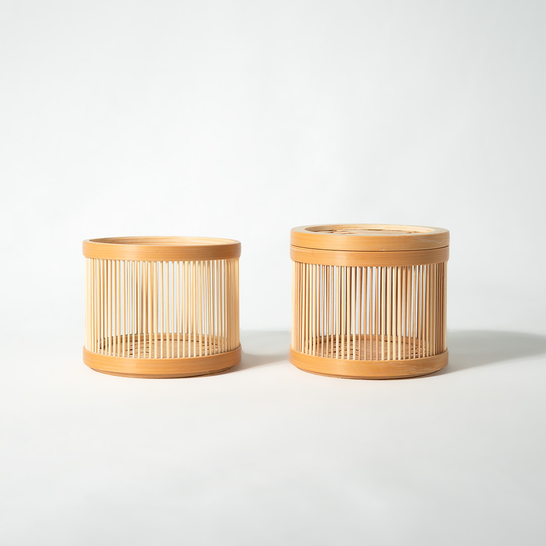 2個で1セット、ヒゴの太さの違うキットと、ヒゴの色が違うキットを組み立てます。ヒゴは差し返しという技法を使います。片側の輪にさしたヒゴをもう片方の輪にピンセットで穴に引っかけ、上から押してしっかりと差し込みます。ヒゴの太さの違いと色の違いで優しい雰囲気のストライプ模様になります。積み重ねて使っても可愛らしく便利な小物入れです。前回のスタック式小物入れを体験していただいた方は、そちらとも重ねて使う事が出来ます。