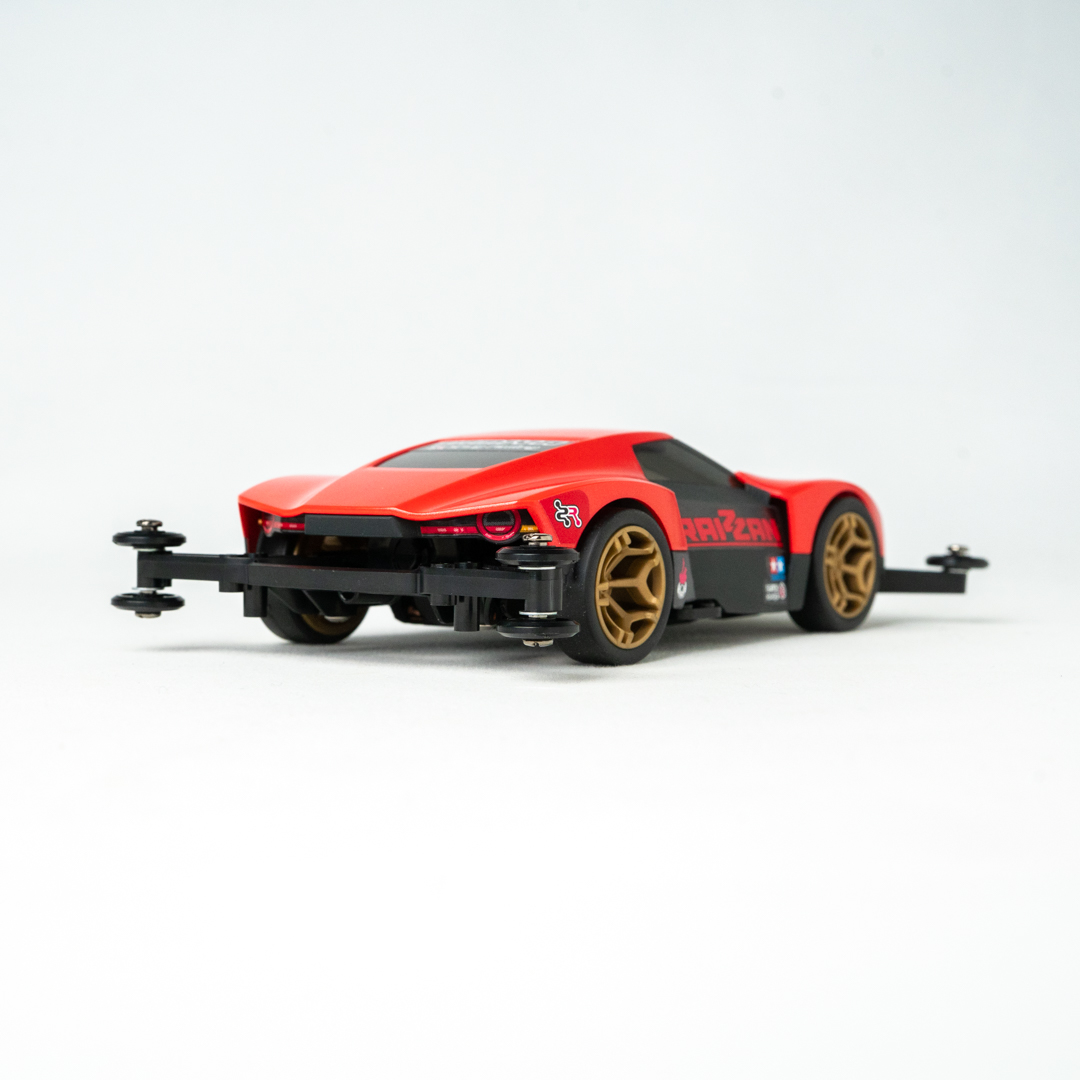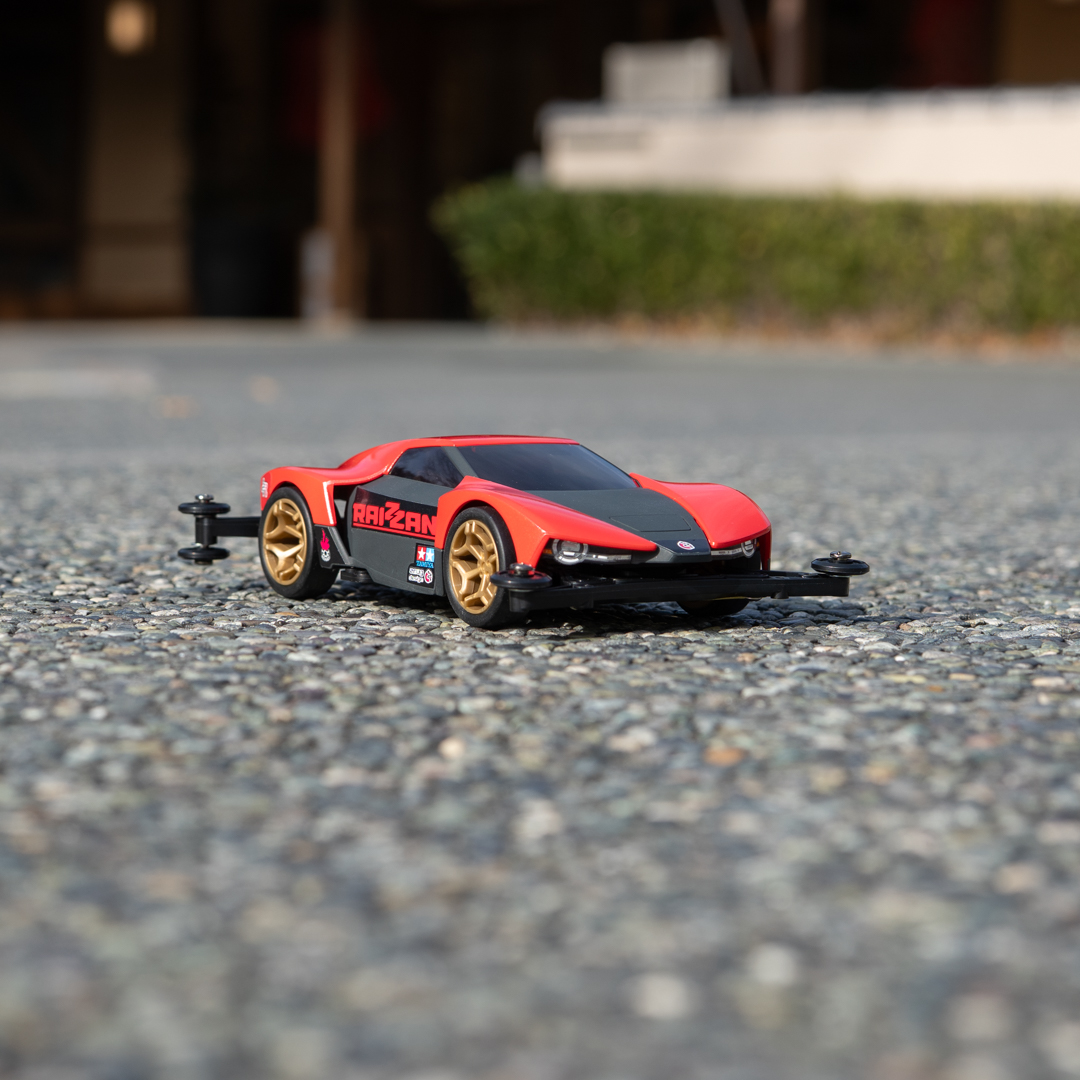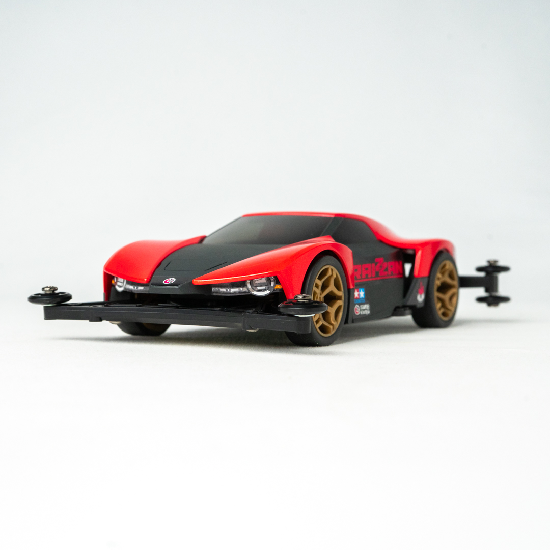 シャーシは新開発のMEシャーシを採用。低く鋭いフォルムのボディはハヤブサやワシなどの猛禽類をイメージし、実車のハンエンドスポーツカーのモノコック構造を思わせるスモークカラーのセンターパーツに、レッドのボディパネルを取り付ける構成。まるで実車を作っているかのような気分で組み立てられるのはもちろん、パネルを取り外したオープントップ状態にも仕上げられます。スタッフが制作をサポートしますので、初めての方も安心して体験していただけます。