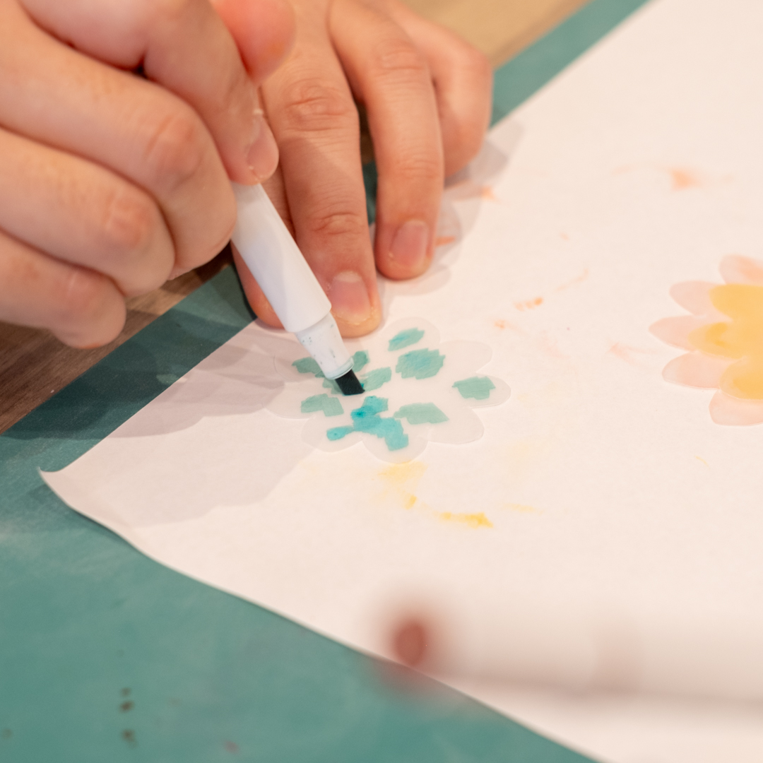 お好きな色で着色しアルコールで含ませたペーパーでこすり、グラデーションを表現したり自分色のお花をつくりましょう。
