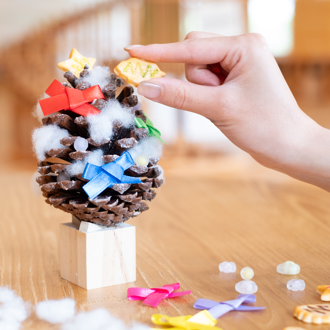 大きな松ぼっくりに、軽量ねんどでつくった本物みたいなクッキーとカラフルなリボン、キャンディのようなビーズを付けてオリジナルのツリーをつくりましょう。玄関やお部屋に飾って素敵なクリスマスをお迎えください。