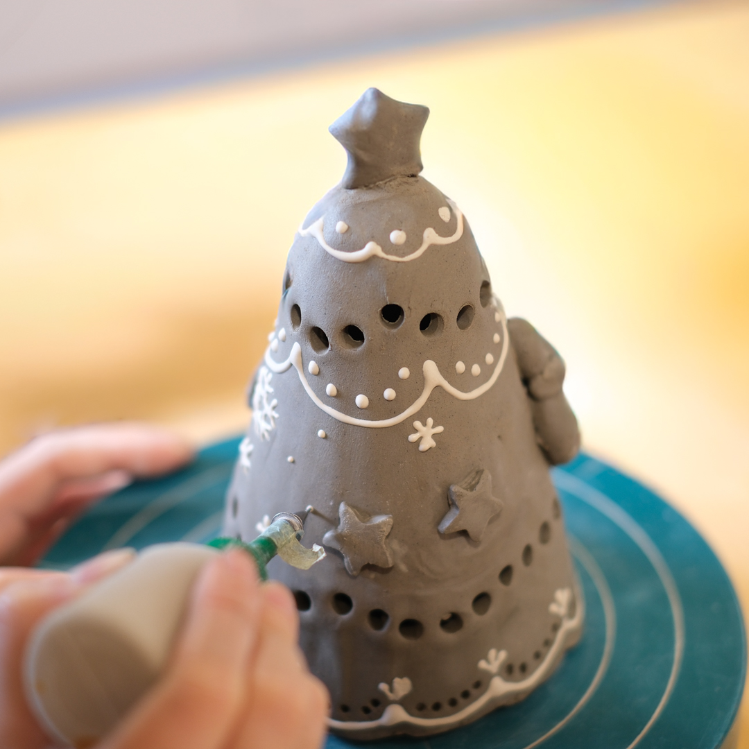 穴をあけたり、白い泥でぷっくりした絵を描いたり、飾りをくっつけてみたり。自分だけのクリスマスツリーをつくっちゃおう!
