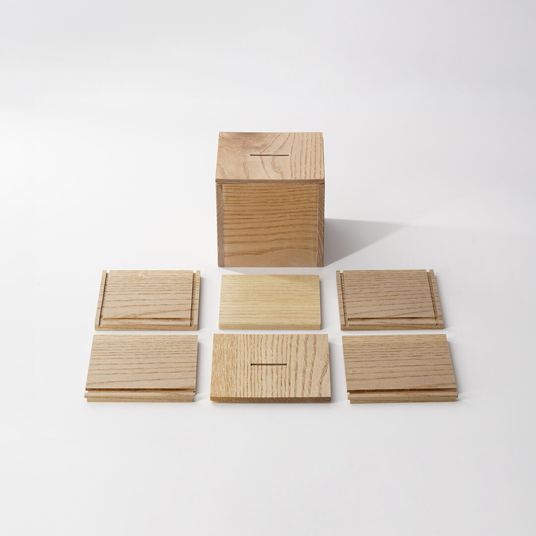 指物職人の技が光る木目が美しい貯金箱です。パーツの溝にボンドをつけて組み上げるので簡単につくることができます。500円玉貯金をすれば10万円貯めることができます。