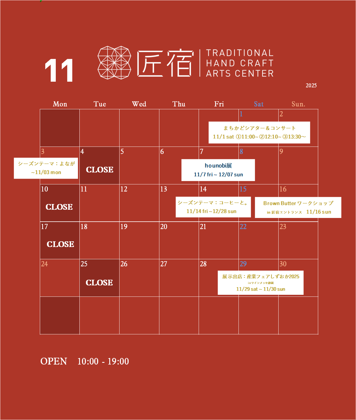 11月の営業スケジュールのご案内です。 木々が少しずつ色づきはじめ、秋の深まりを感じますね。ほっとする時間を過ごしにぜひお立ち寄りください。 みなさまのお越しをお待ちしてお...