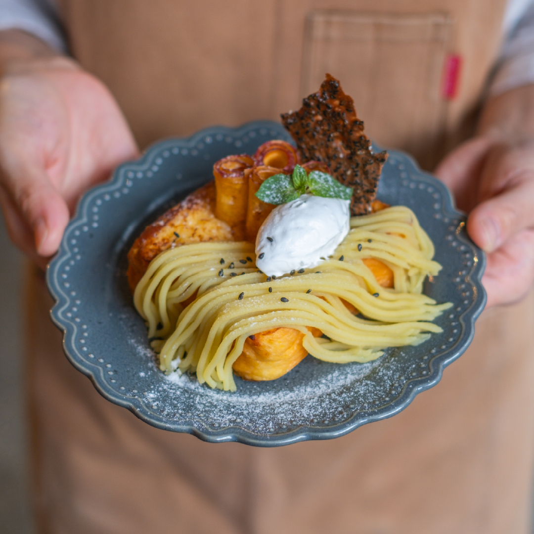 フレンチトーストに浜松産のうなぎ芋ペーストをたっぷり絞りました。