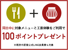 期間中の平日に「体験工房」と「匠宿内カフェ」のマンスリーメニューをあわせてご利用いただくと100pプレゼント!