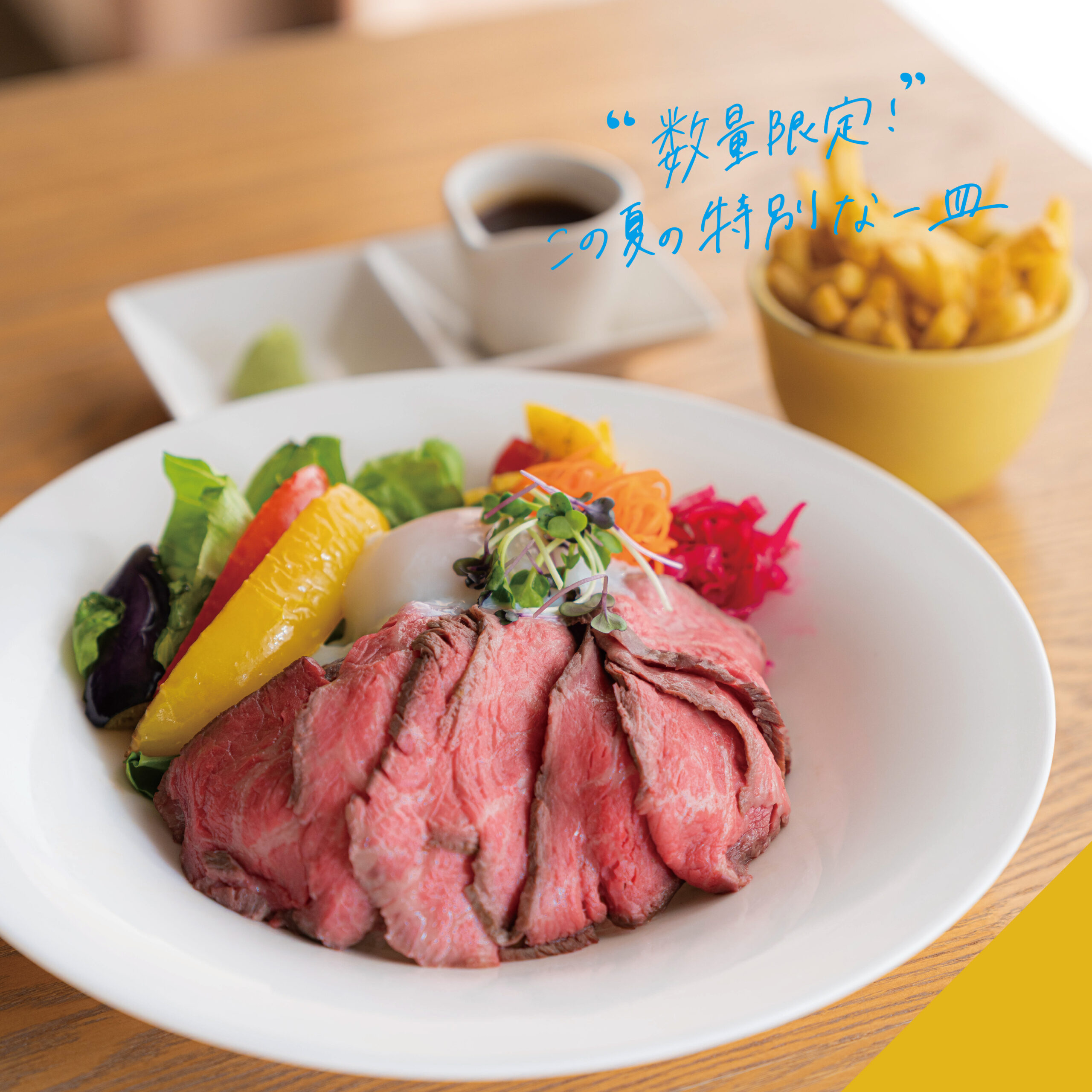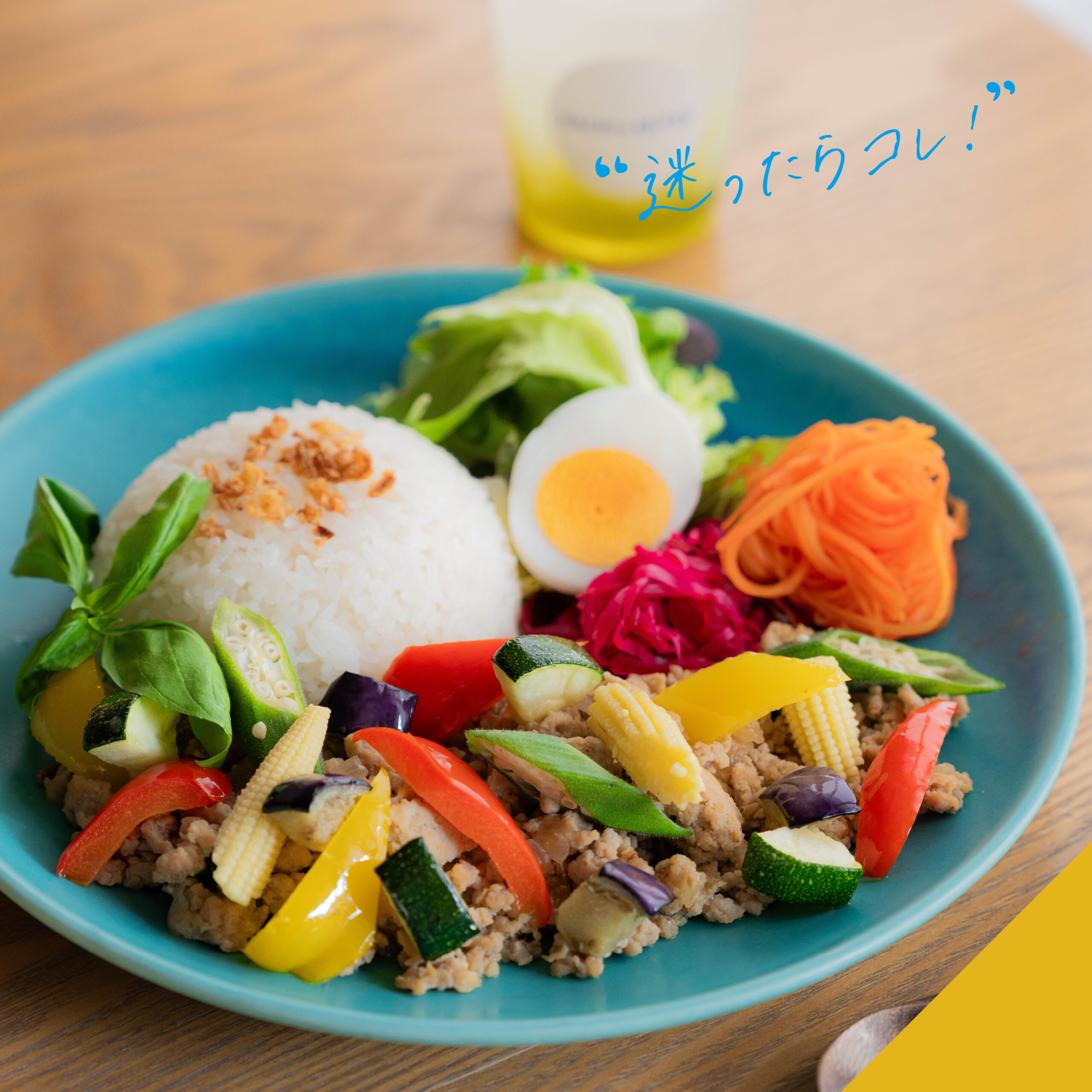 | 国産牛を使用したしっとりやわらかなローストビーフに甘めの和風ソースにとろ~り温玉をのせた贅沢なひと皿です。 | 彩り豊かなシャキシャキの夏野菜とたっぷりのひき肉を合わせた辛さ控えめ、ヘルシーガパオライスです。 | |