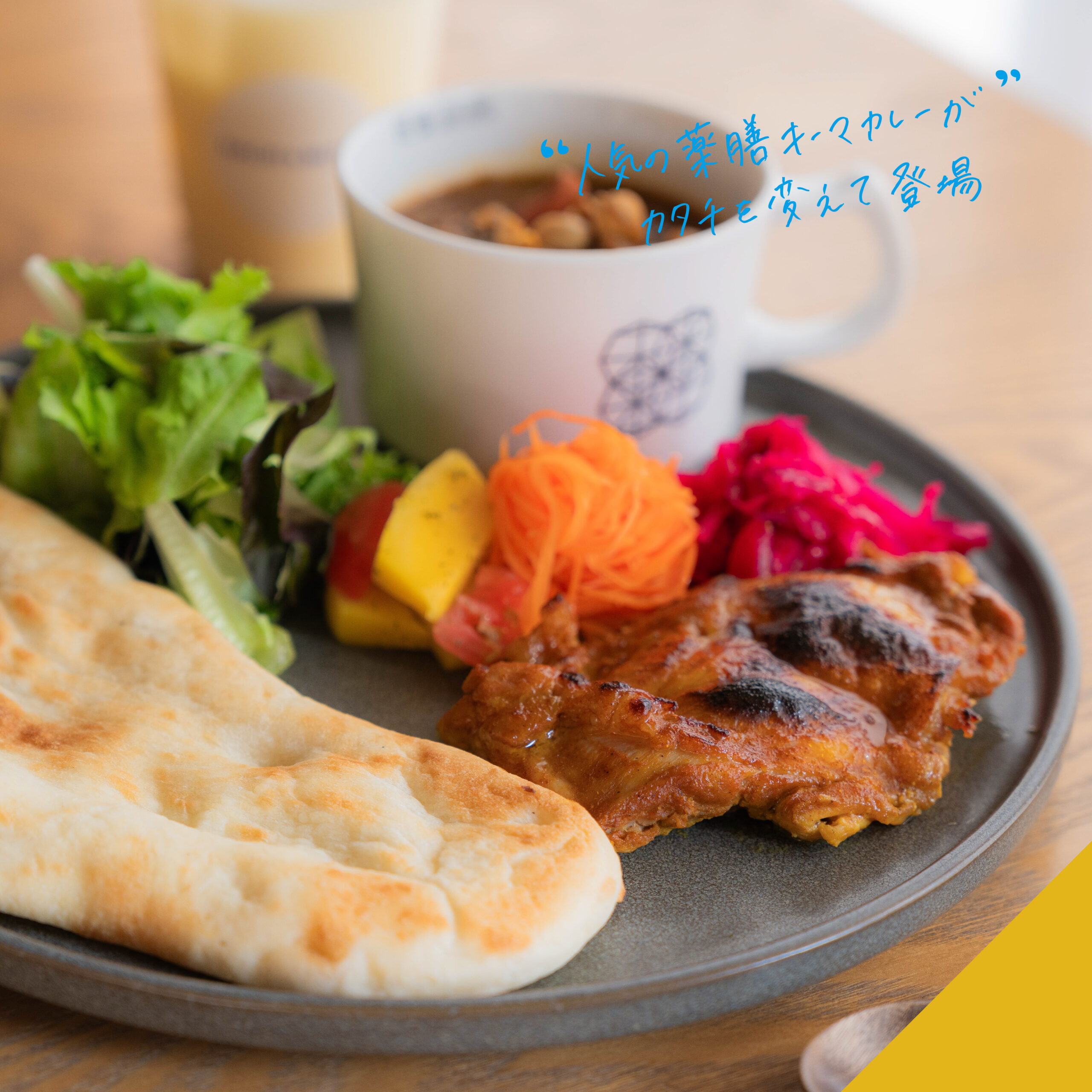 | HACHI&MITSU人気メニューの薬膳キーマカレーがカタチを変え,夏限定で登場!カレーをつけたり、チキンをはさんだり、ご自由にお召し上がりください。 | とろけるサーモンとまぐろの赤身の王道コンビを特製のピリ辛ダレに漬け込みました。アボカド、錦糸卵、たっぷりの薬味が加わり食欲をそそります。 | 甘くてジューシーなアメーラトマトと、香り高い自家製大葉ジェノベーゼが出会った夏限定の冷製パスタです。 | ||