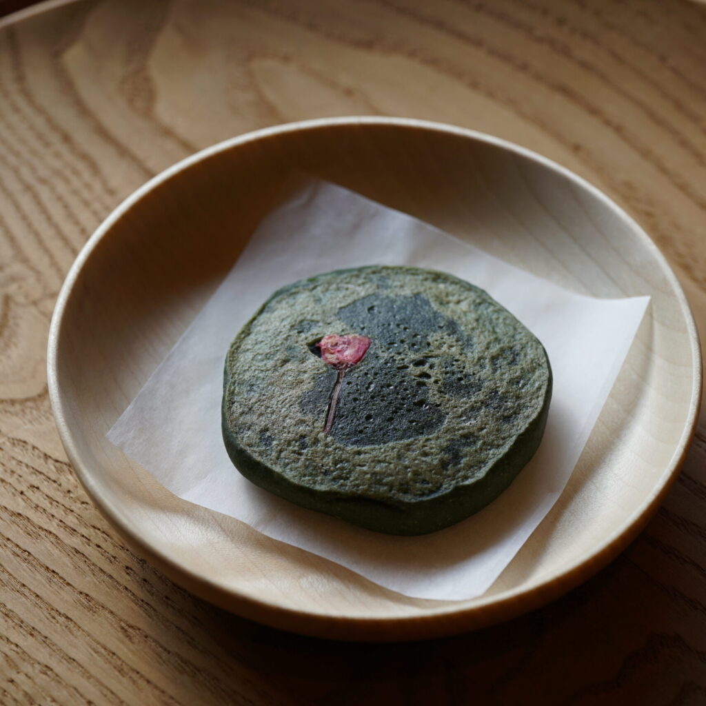 さくら餡を蓬の生地で包み、桜の塩漬けの花をのせて焼き上げた、春限定の『桜きんつば』