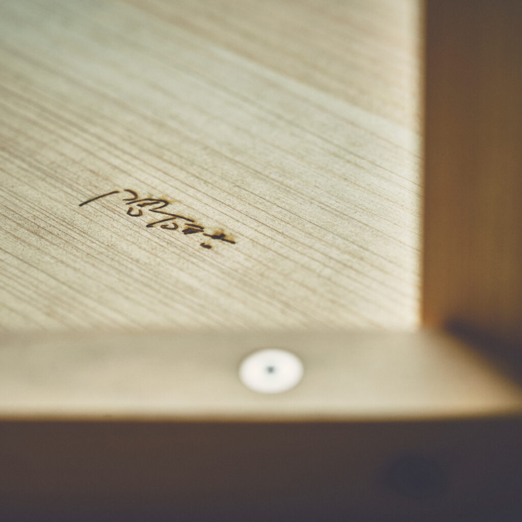 天板には静岡県産の厚みのあるヒノキを贅沢に使用し、裏にはレーザーで彫刻された隈研吾氏のサインが。