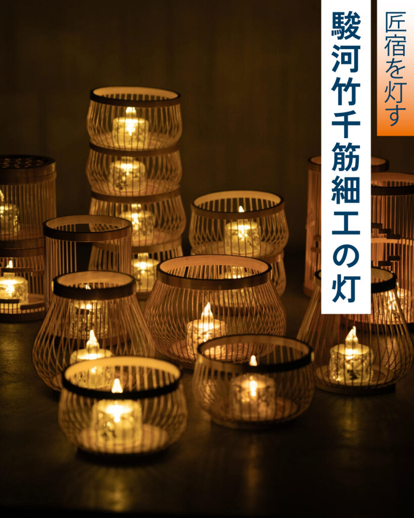 駿河竹千筋細工の職人の実演。匠宿オリジナルブランド「hounobi」も展示。会場内にある灯りもお楽しみください。