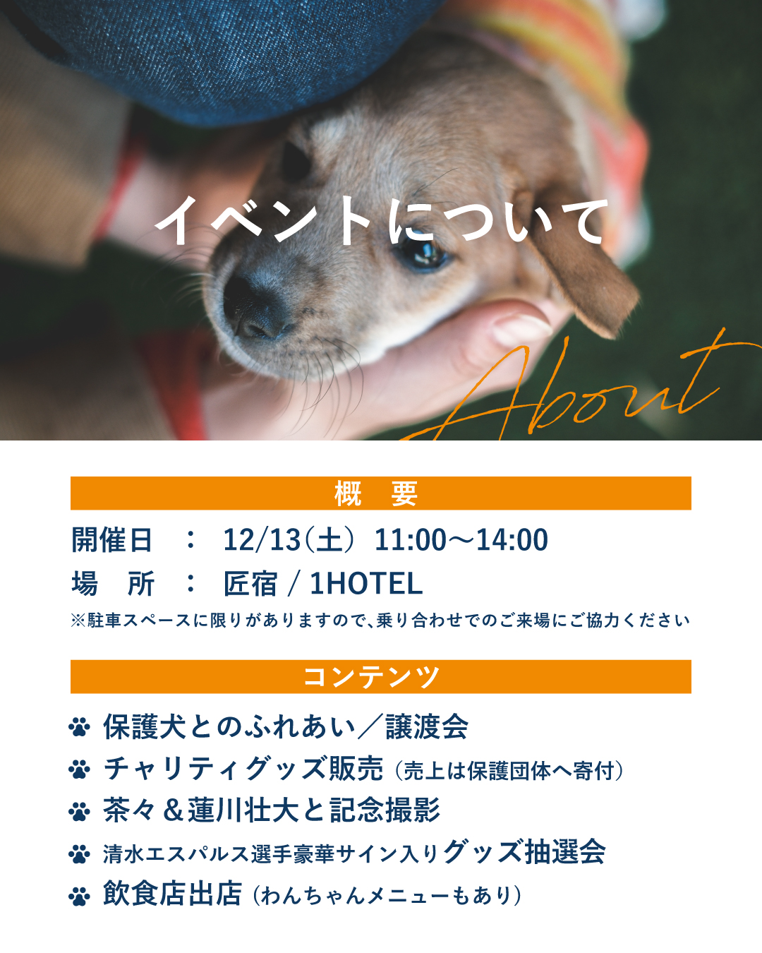 12月13日(土)、匠宿と1HOTELにて、プロサッカー選手蓮川壮大選手主催の「WAN FAMILY – 保護犬と繋がるオレンジの日」 を開催いたします。