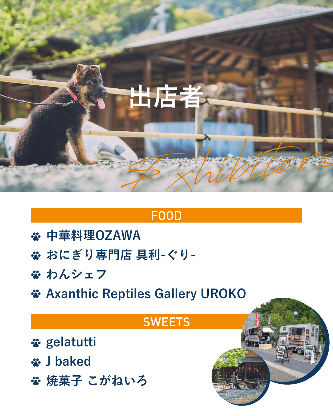 当日は、会場内に複数の飲食店・キッチンカーが出店し、イベントを一緒に盛り上げていただきます。一部店舗ではワンちゃん向けメニューもご提供いたします。