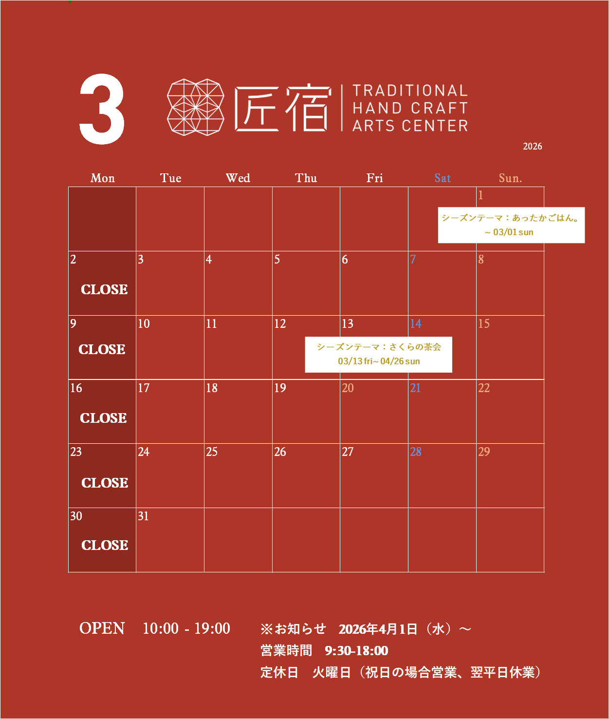 平素より駿府の工房 匠宿をご利用いただき、誠にありがとうございます。このたび、運営体制の見直しに伴い、2026年4月1日(水)より、営業時間および定休日を変更させていただきます。 【変更前】 ...