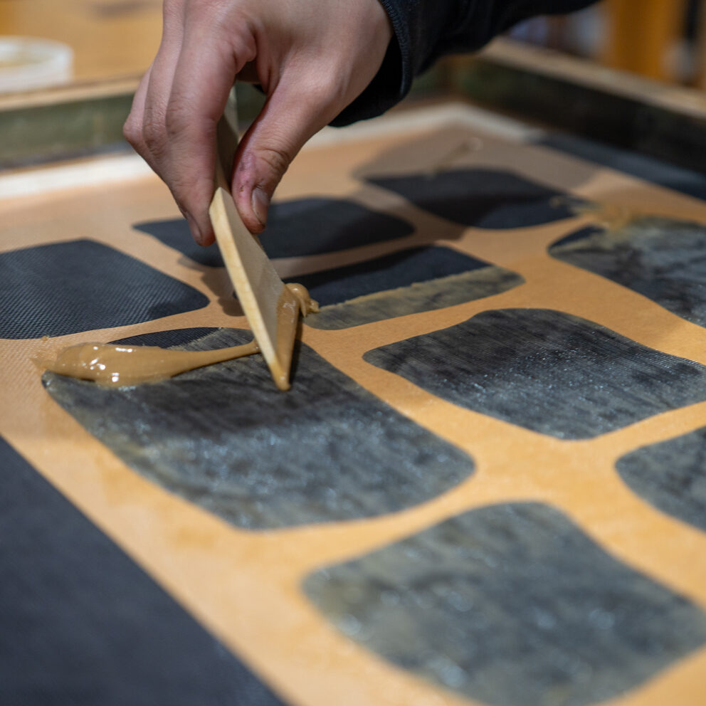 製造工程で廃棄されてしまう茶葉を染料に使用し、伝統工芸の駿河和染めの技術で染めていきます。