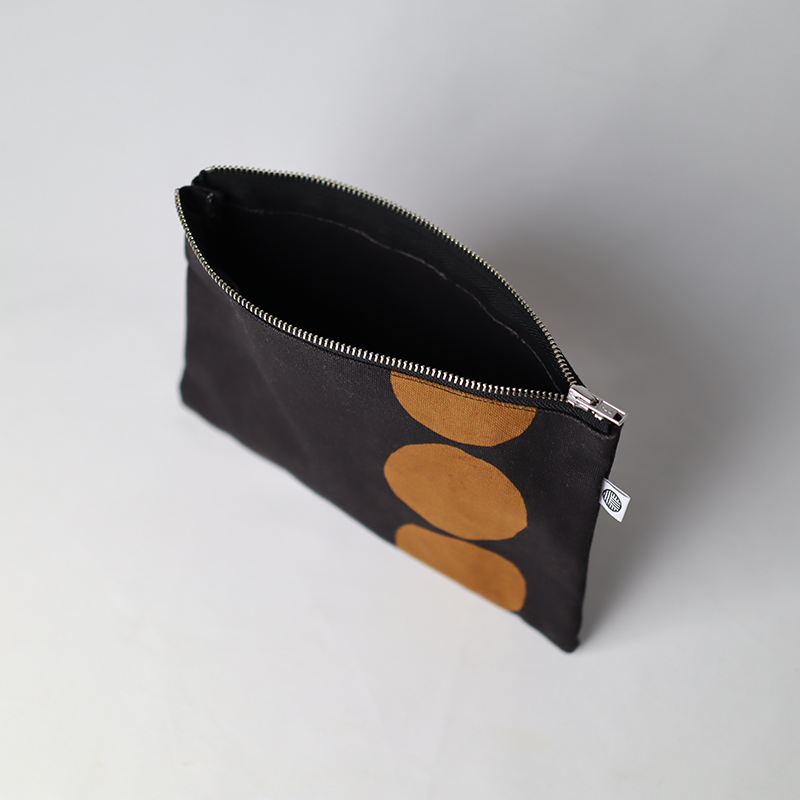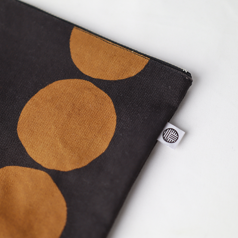 オーガニックコットン8号帆布生地をお茶染めした商品。生地の風合いを活かすよう無地染めで仕上げています。シックで上品な仕上がりです。お茶染めは製造工程で出る商品にならない部分の茶葉を使用し、何度も染め重ねています。煮出した後の茶殻は堆肥に加工し畑へと循環していきます。まるで革製品のような経年変化も楽しめるポーチです。こちらは茶の身柄タイプとなります。少しいびつな丸が大胆に配置されたかわいい人気の柄です。
