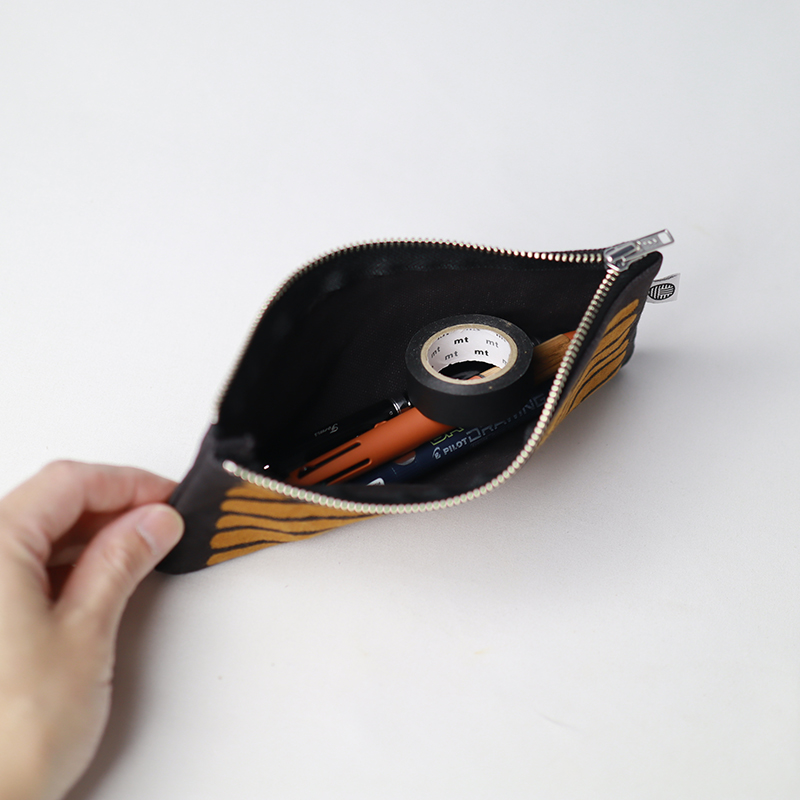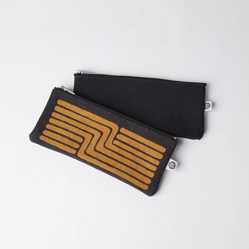 オーガニックコットン8号帆布生地をお茶染めした商品。生地の風合いを活かすよう無地染めで仕上げています。シックで上品な仕上がりです。お茶染めは製造工程で出る商品にならない部分の茶葉を使用し、何度も染め重ねています。煮出した後の茶殻は堆肥に加工し畑へと循環していきます。まるで革製品のような経年変化も楽しめるポーチです。こちらは茶の身柄タイプとなります。少しいびつな丸が大胆に配置されたかわいい人気の柄です。