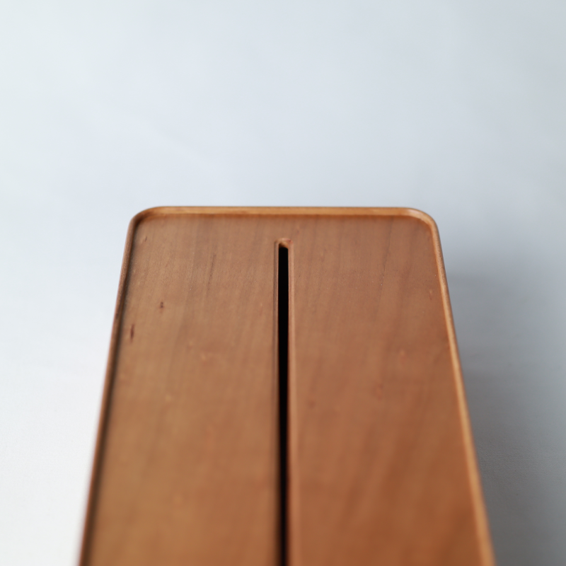 無垢材を丁寧に削り出し、余計な装飾を削ぎ落とした端正なフォルムです。やわらかく落とされたエッジと、美しく流れる木目が、空間に穏やかな緊張感をもたらします。