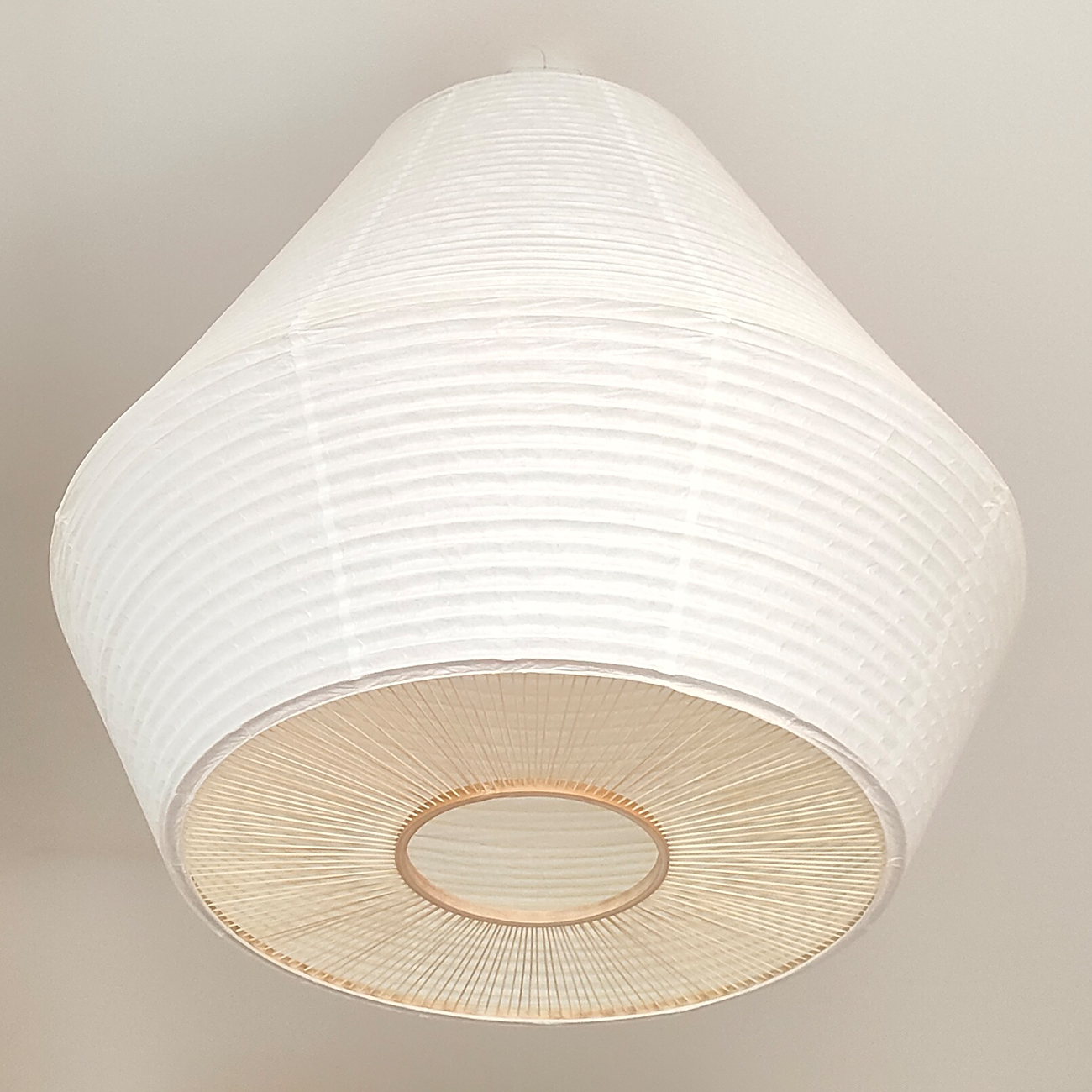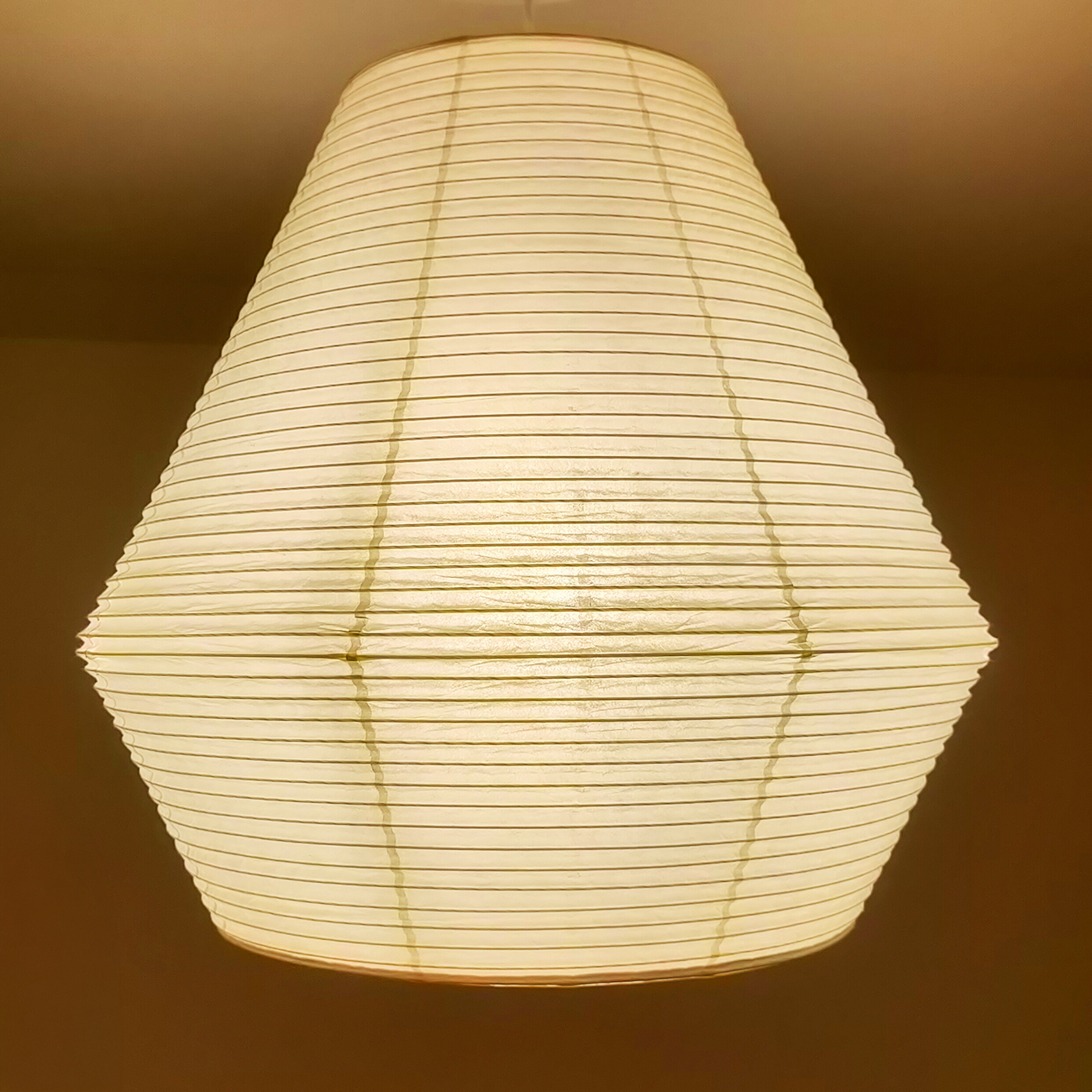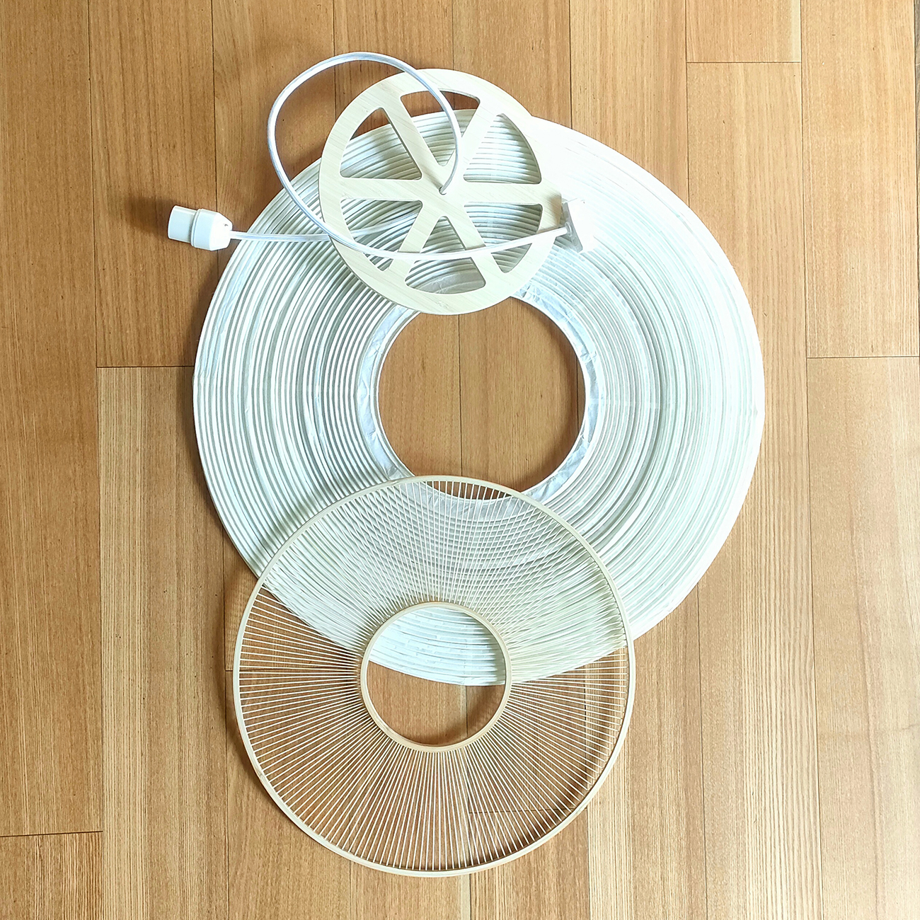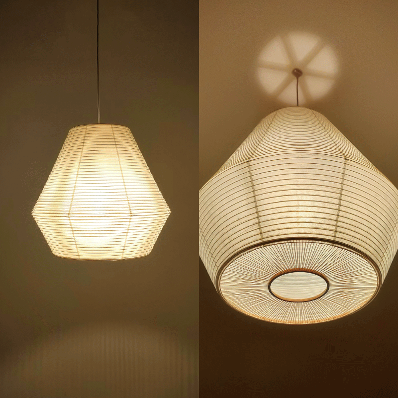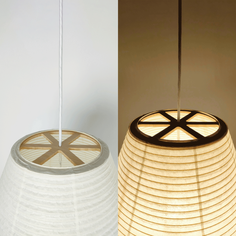 「紡ぎ」──竹のしなやかさと和紙の優しさを結ぶ。通常の和紙提灯では、竹や針金のヒゴが用いられますが、本作では PET樹脂製のヒゴに薄い和紙を巻き付けることで、やわらかな質感を生み出しつつ、ひご自体が落とす影を抑えています。