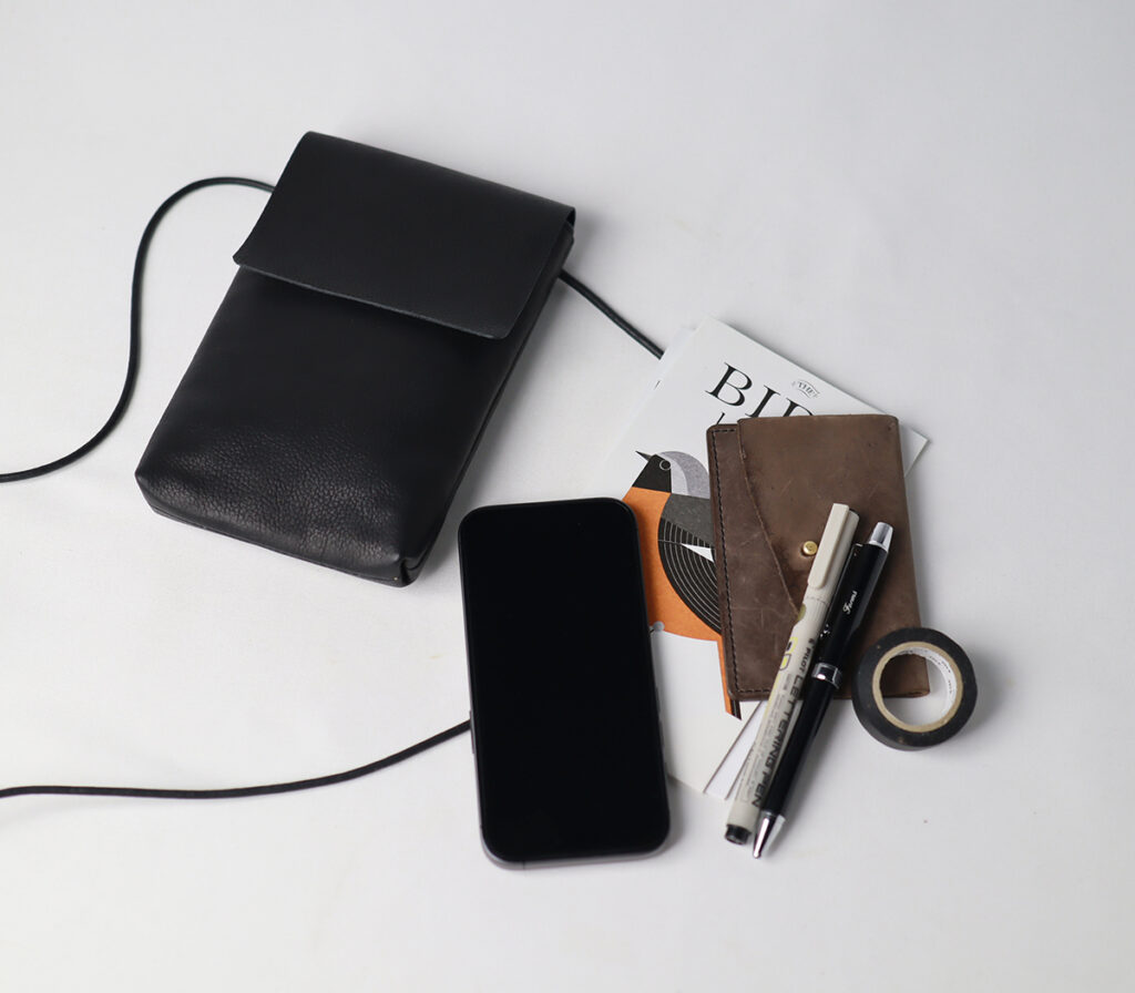 携帯・メモ・ペン2本・名刺入れが入る大きさ。