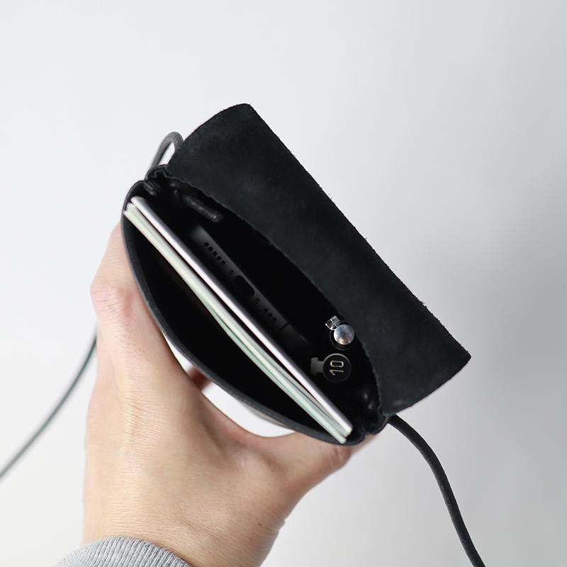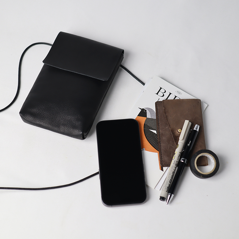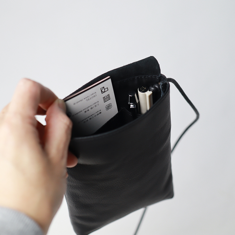 携帯・メモ・ペン2本・名刺入れが入る大きさ。