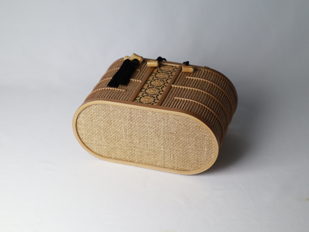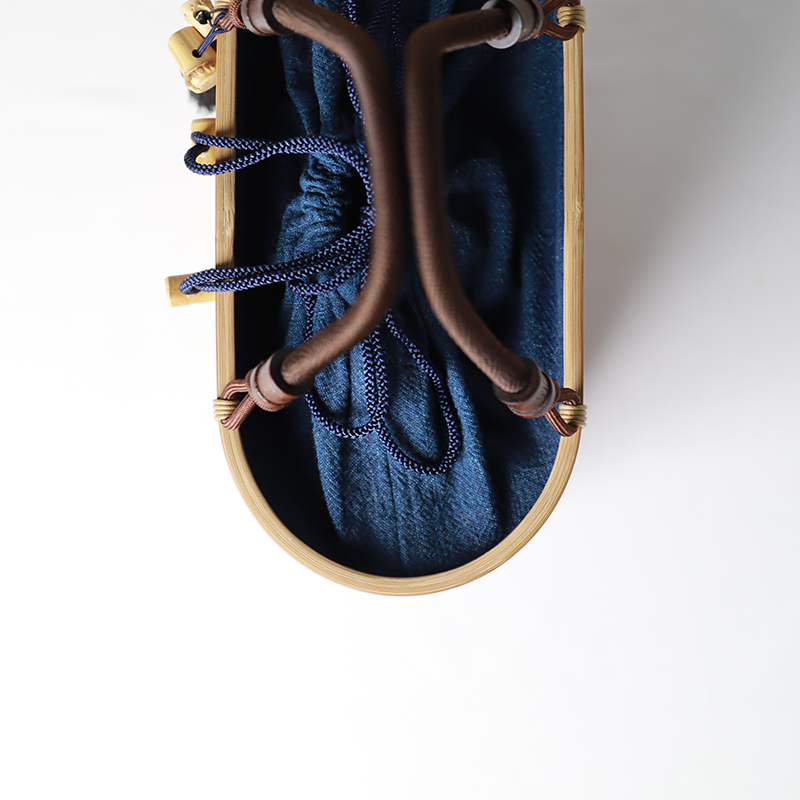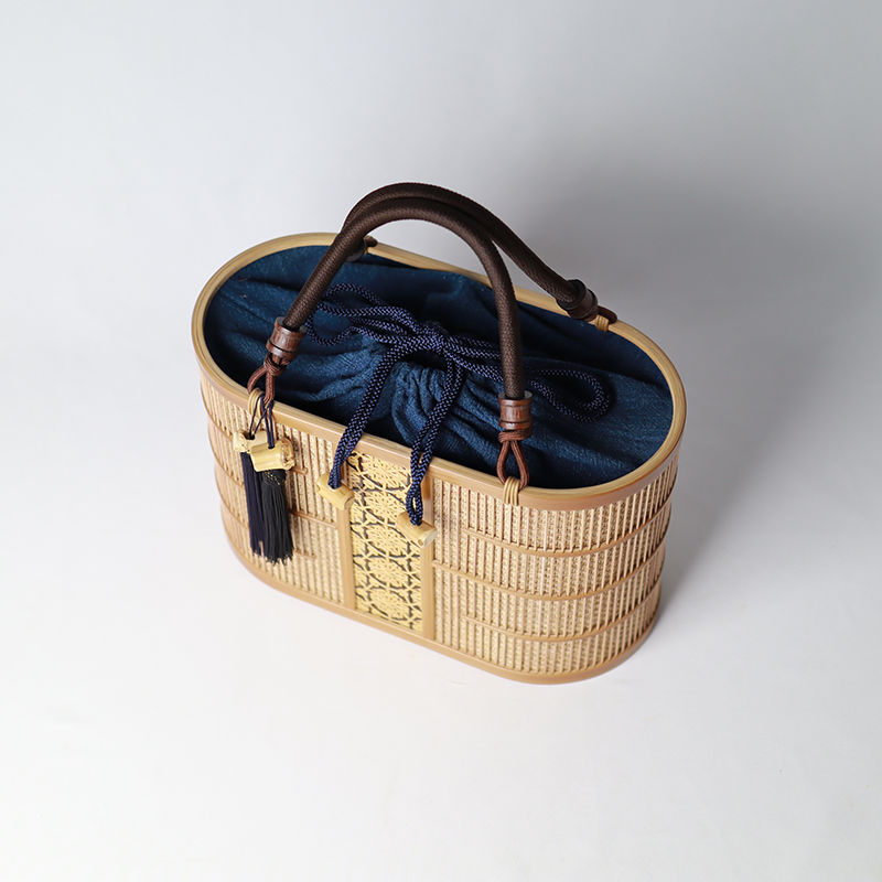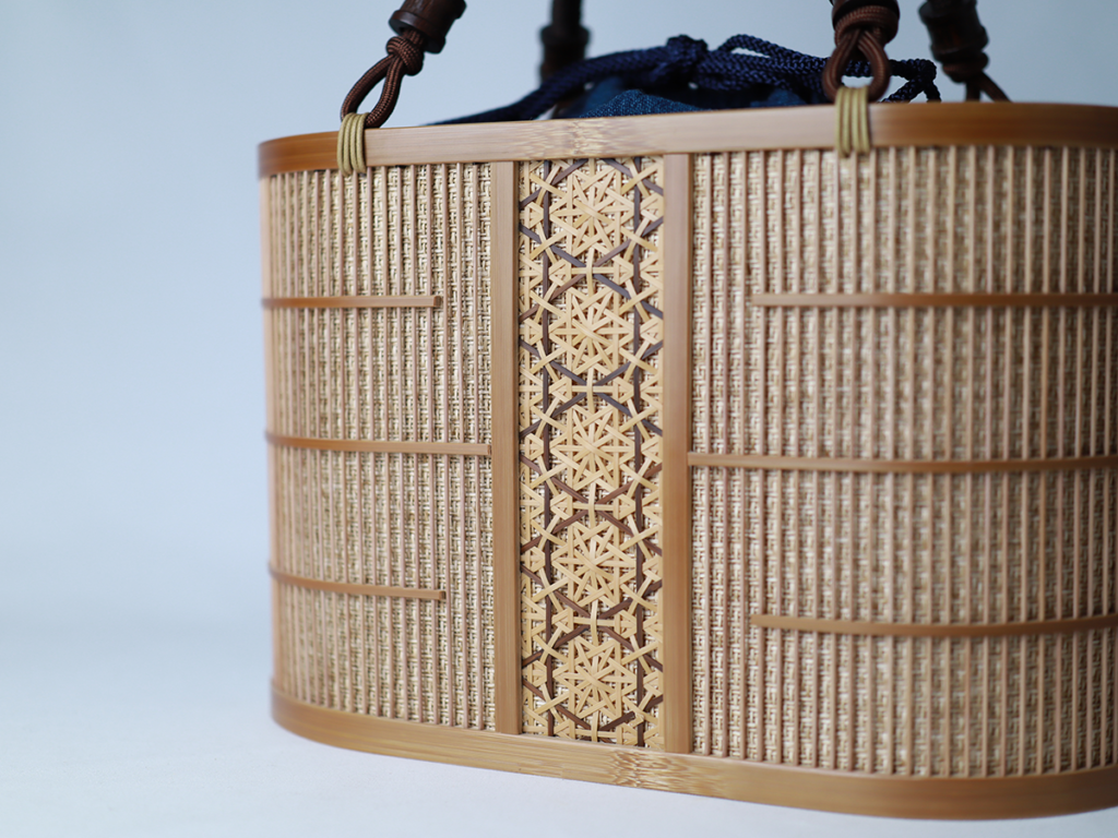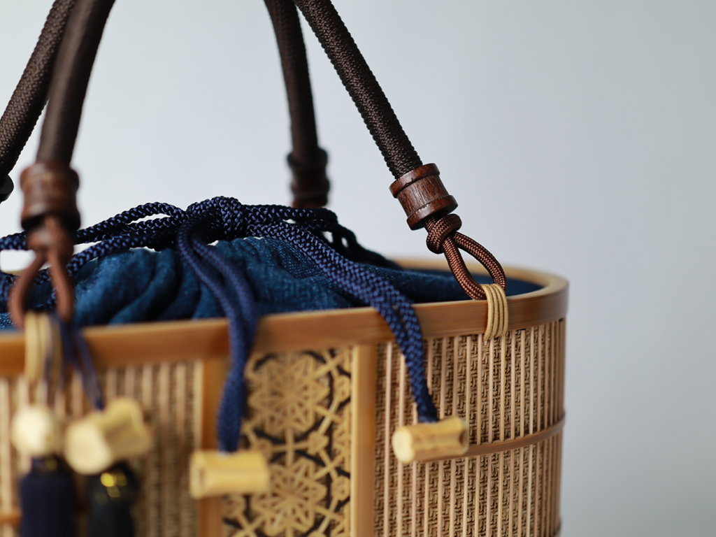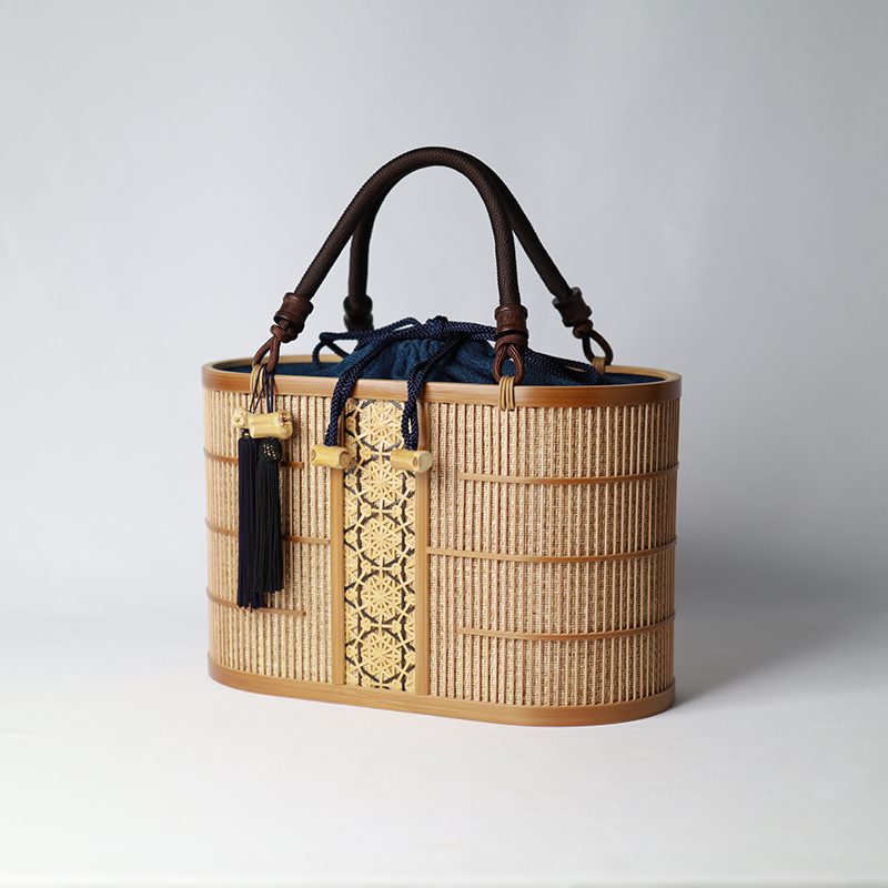静岡の伝統工芸「駿河竹千筋細工」でつくられたバッグ。縁起の良い麻の葉の模様と、縦に横に美しく伸びた竹千筋の技が際立ちます。楕円の形状は奥ゆかしくやわらかさを感じさせてくれます。中の巾着は藍染の備後絣(びんごがすり)。着物などの和装はもちろんのこと、デニムなどのナチュラルな装いにも合わせられます。近頃は20代女性からも支持され、老若男女問わずおすすめしたい手提げバッグです。