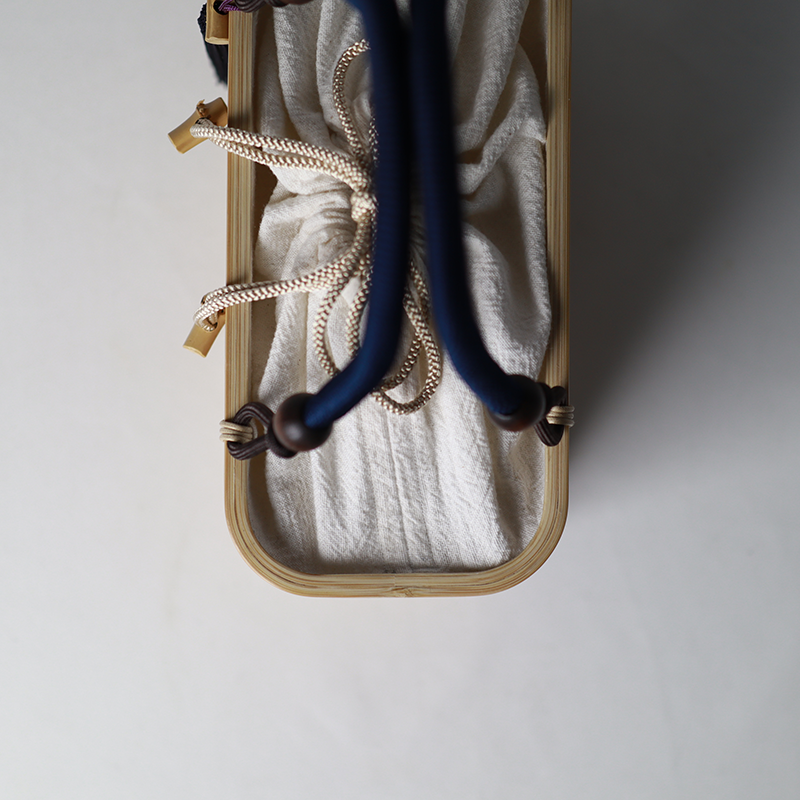 静岡の伝統工芸「駿河竹千筋細工」、職人技が光る角曲げの竹バッグです。竹千筋の織りなす美しさが際立ちます。縁起の良い麻の葉の模様がアクセント。巾着は白色でやさしく軽やかな印象を受けます。着物などの和装はもちろんのこと、デニムなどのナチュラルな装いにも合わせられます。近頃は20代女性からも支持され、老若男女問わずおすすめしたい手提げバッグです。
