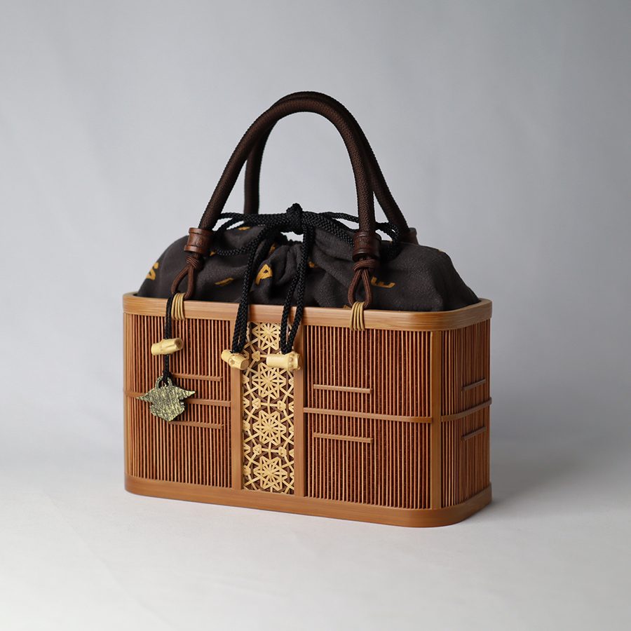 バッグ本体は「駿河竹千筋細工」の長角古代の竹バッグです。縁起の良い麻の葉の模様と、縦に横に美しく伸びた竹千筋の技が際立ちます。着物などの和装はもちろんのこと、デニムなどのナチュラルな装いにも合わせられます。近頃は20代女性からも支持され、老若男女問わずおすすめしたい手提げバッグです。