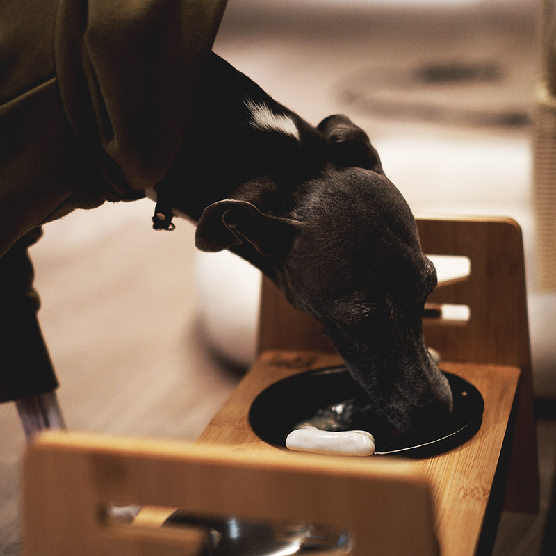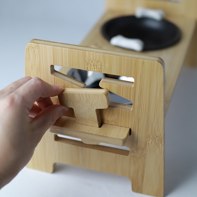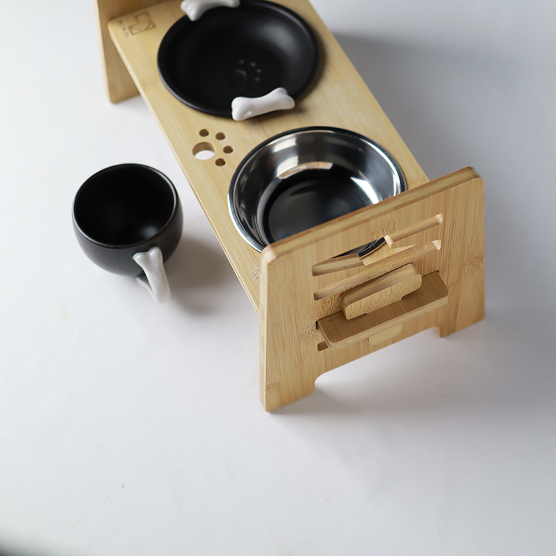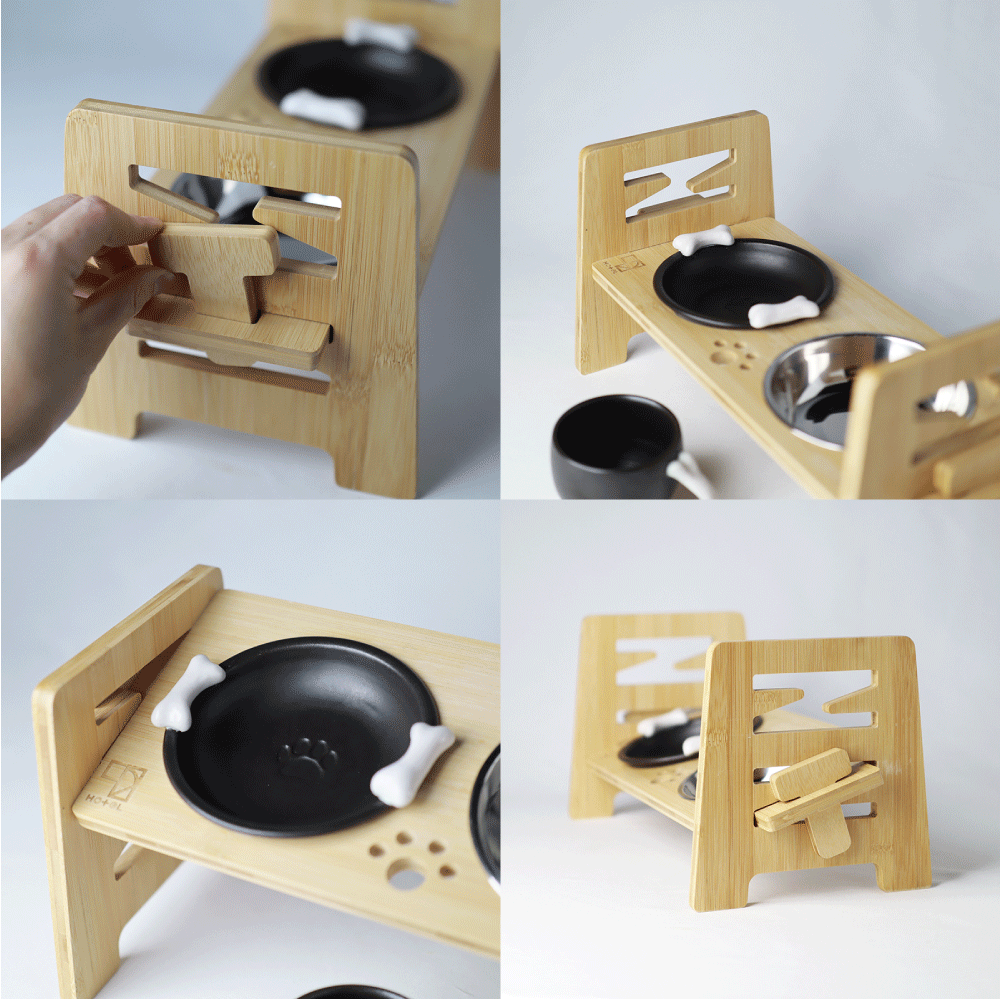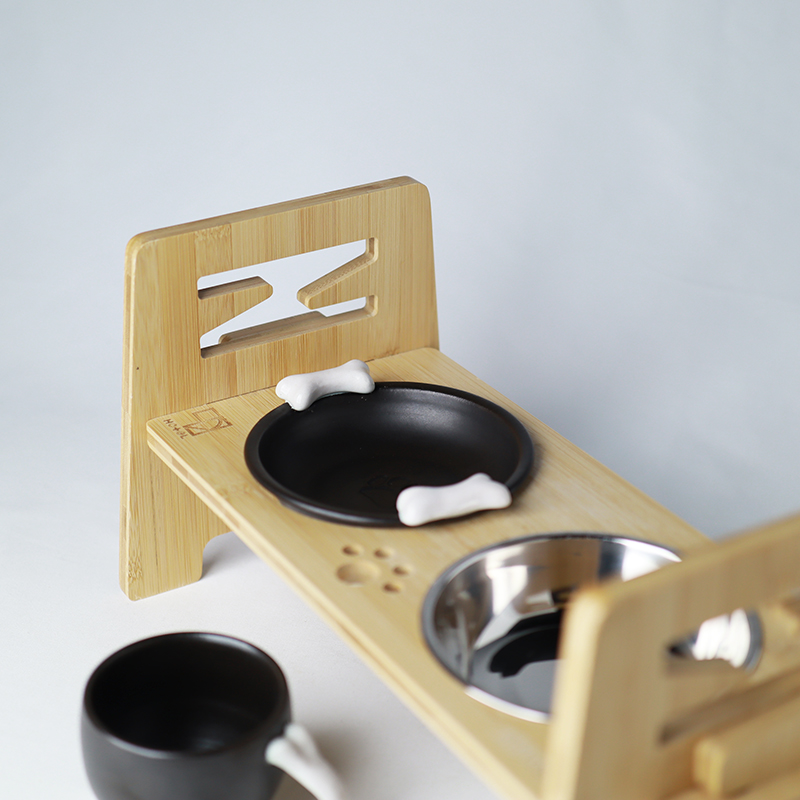 フードボウルと水のボウルが入り、高さや角度が調整できる便利な仕様です。ワンちゃんと一緒におそろいの陶器を使って、素敵なお食事時間をお楽しみください。
