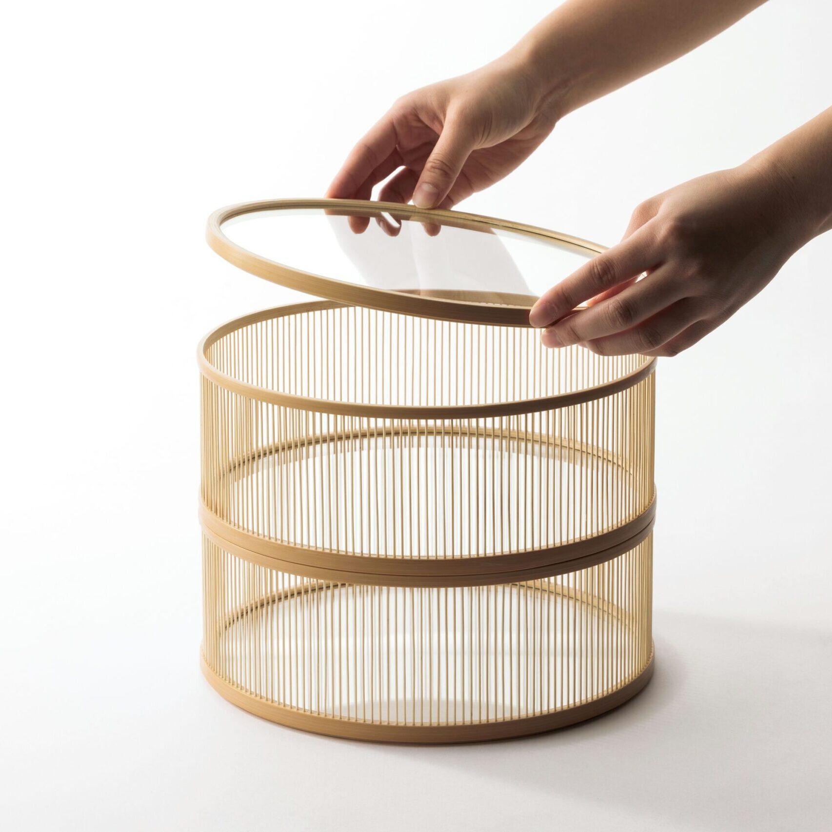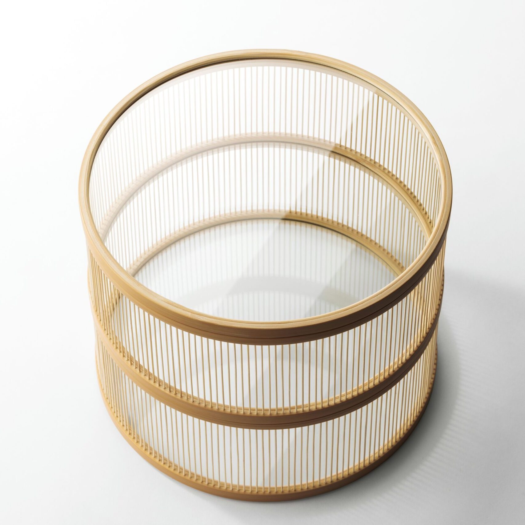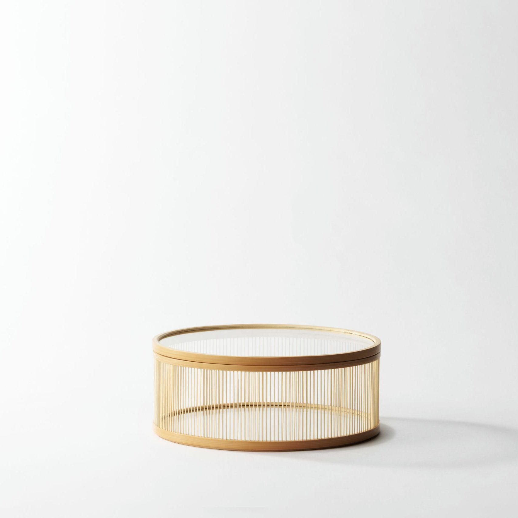 これを引き立てるために、従来は編まれた竹を用いる面材を、より存在感の軽薄なガラスに置き換え、菓子器をつくりました。