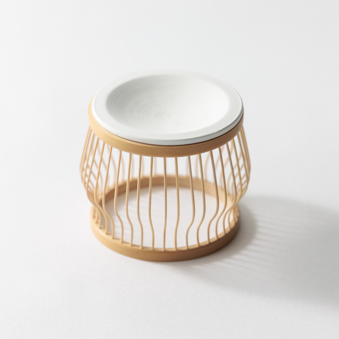 柔らかな竹フレームと硬く滑らかなセラミックの対比が、軽やかさと存在感を兼ね備え、空間を美しく彩ります。