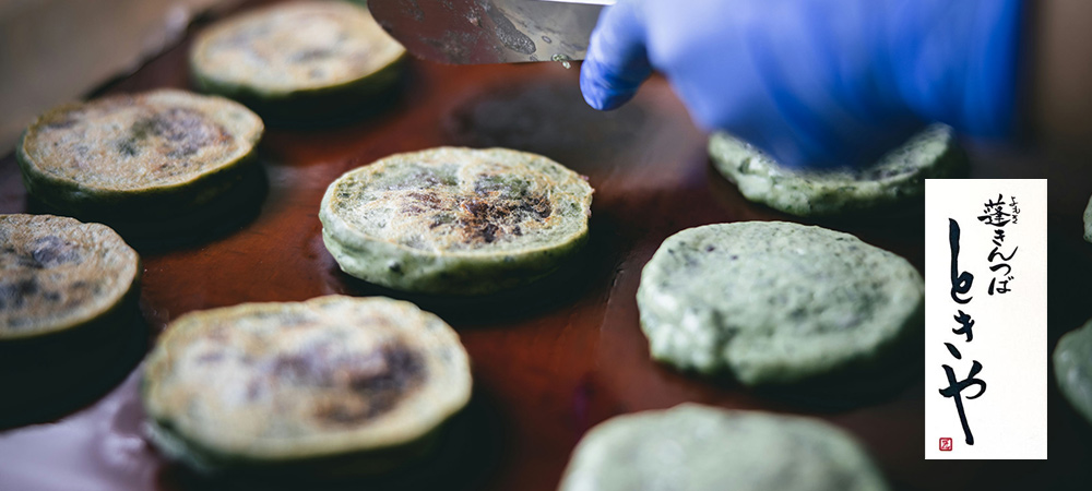 甘さを控えたやさしい餡を、風味豊かな蓬(よもぎ)の生地で包み込み、ひとつひとつ丁寧に焼いて作り上げる蓬きんつば。ときやの店頭にある大きな窓からはスタッフがひとつひとつ丁寧に焼き上げている姿をご覧になることができ、オープン時間には温かい出来立てが並びます。
