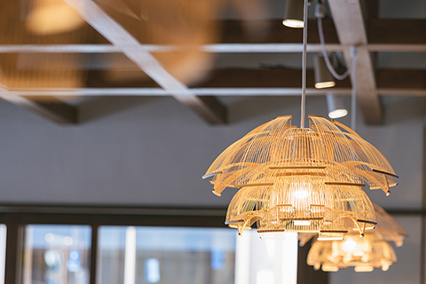 「駿河竹千筋細工」のインテリアパネルや照明をはじめ、静岡の工芸品と木材を贅沢に使用した落ち着いた空間の店内。自然豊かで心やすらぐ景観を味わえるテラス席。